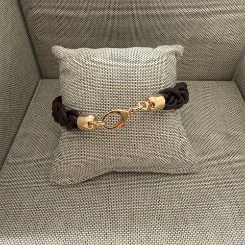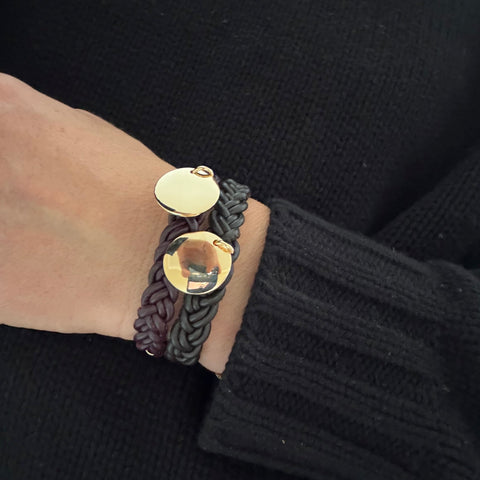 HANDGEFLOCHTENES LEDERARMBAND | 20 mm RUNDE PLAKETTE | 18 KT GOLDPLATTIERTES MESSING | LÄNGE: 19 cm